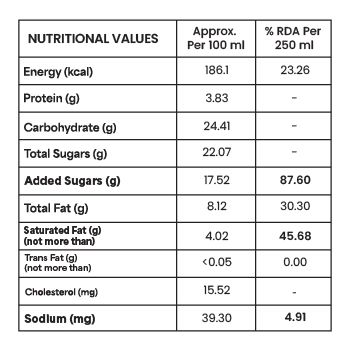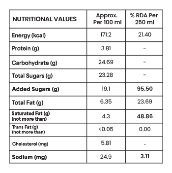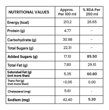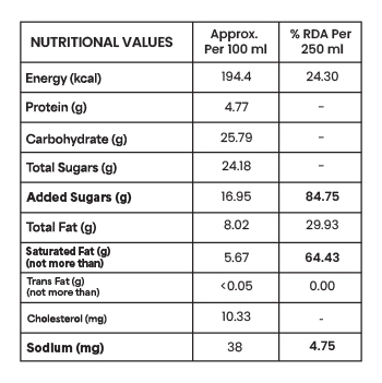 Milk, Milk Solids, Sugar, Gulkand (1.3%), Dates (1.3%), Fennel seeds (1.3%), Cucumber Seeds (0.5%), Poppy Seeds (0.5%), Stabilizers: INS407, INS412, INS415, INS466, INS471.